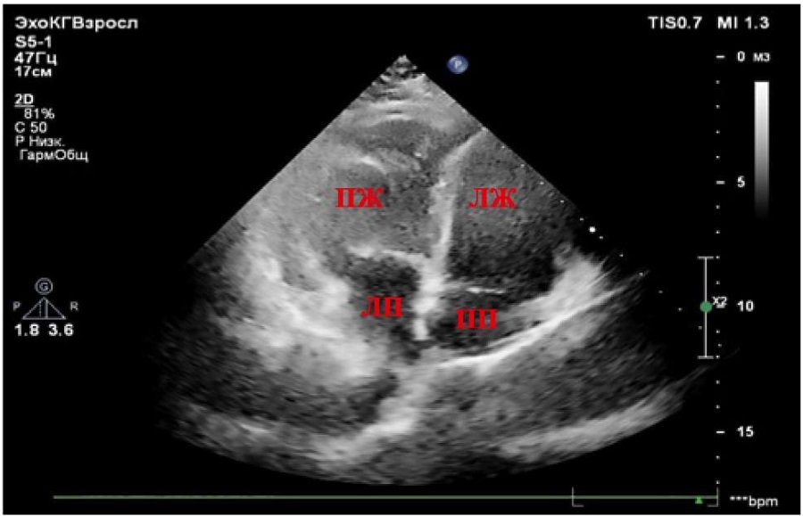 Примечание: ПЖ — правый желудочек, ЛЖ — левый желудочек, ЛП — левое предсердие, ПП — правое предсердие.