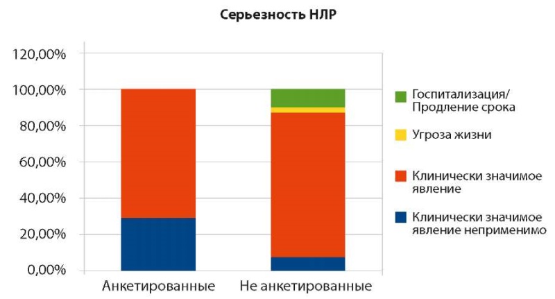 Общая частота развития НЛР составила 7,5%, и в большинстве случаев (49,12%) связь НЛР с ЛС классифицировалась как «возможная» (по шкале Нараджо). При этом между анкетированными и неанкетированными наблюдались статистически достоверные различия в частоте НЛР (4,5% и 8,2%, соответственно) (p<0,05).
