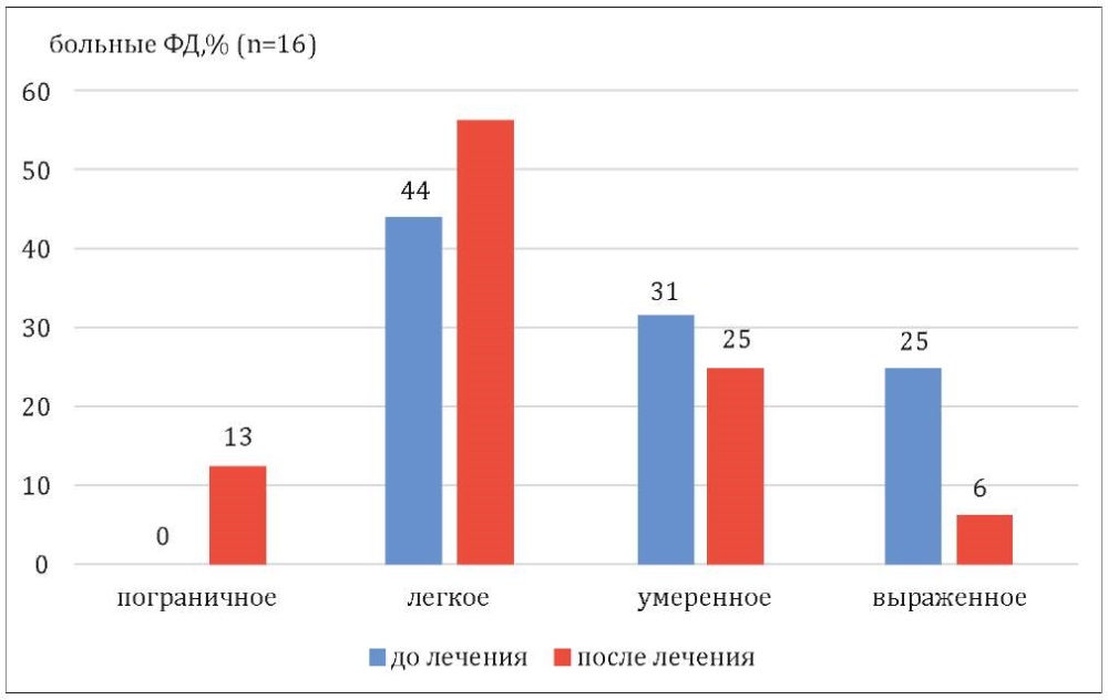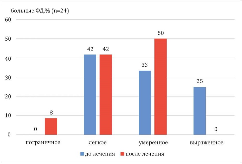 Figure 1. Distribution of patients with FD with a predominance of EPS by the severity of the general condition according to the questionnaire “7×7” before and after treatment with a drug based on an extract of chamomile flowers, marigolds and yarrow
