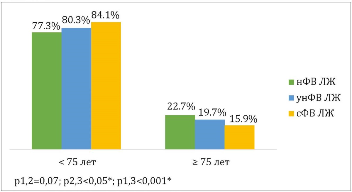 По данным тотального регистра ОКС по Краснодарскому краю установлено, что чаще всего в региональные сосудистые центры с первичным ИМ были госпитализированы мужчины (68,9%) в возрасте <75 лет (81,9%). Статистический анализ показал отсутствие значимой связи между гендерными особенностями и значением ФВ ЛЖ (p>0,05) (рис. 1). В сравниваемых возрастных группах нФВ чаще выявлялась среди пациентов ≥75 лет, однако эта связь не достигла статистической значимости (рис. 2).